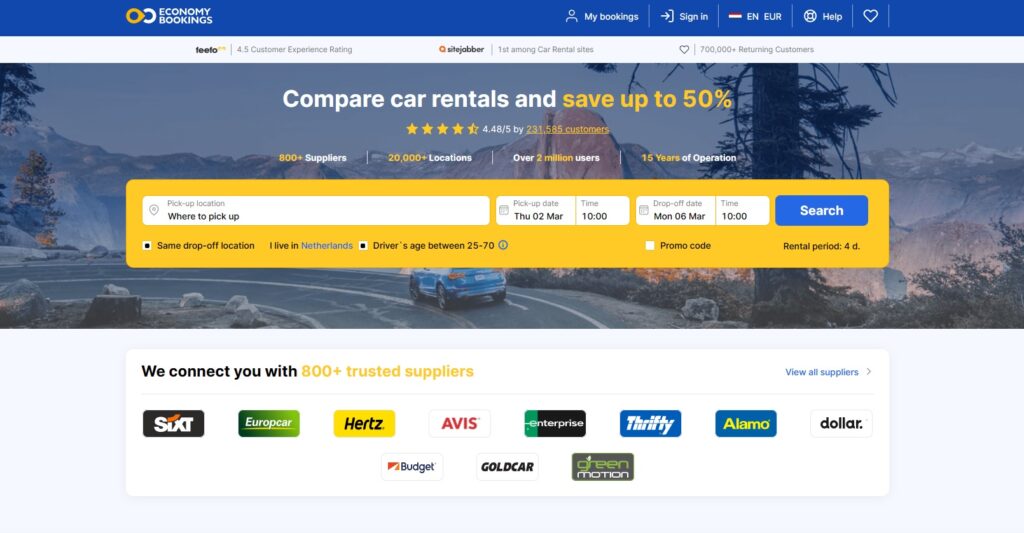 EconomyBookings is an online car rental platform offering services in many different countries around the world. It is a major online rental service with over 25,000 rental locations worldwide and high ratings for the various cars being offered. The platform provides a full description of every car presented on the website to gain customers’ trust. EconomyBookings offers a commission of 60% revenue share.